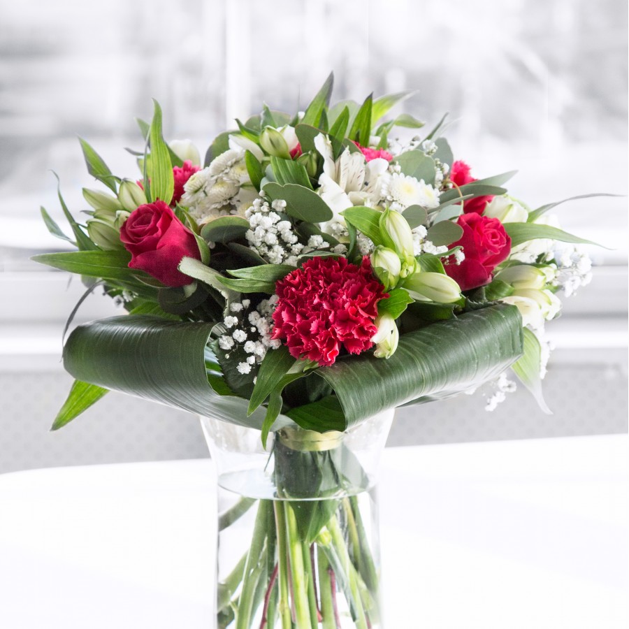 Impeccable service and gorgeous flowers. The aspidistra leaves give the bouquet an elegant look.