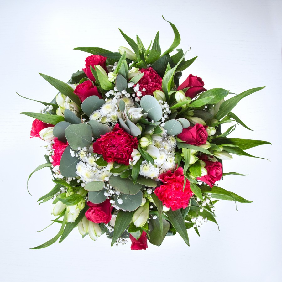 Celebrate special moments with our Lavish Harmony Bouquet, a true testament to artistic floral design. This unique arrangement combines the deep red of roses and carnations with the purity of white chrysanthemums and gypsophila, all arranged alongside elegant white alstroemeria and aspidistra leaves.