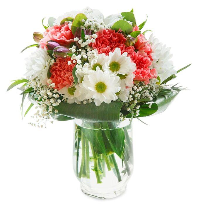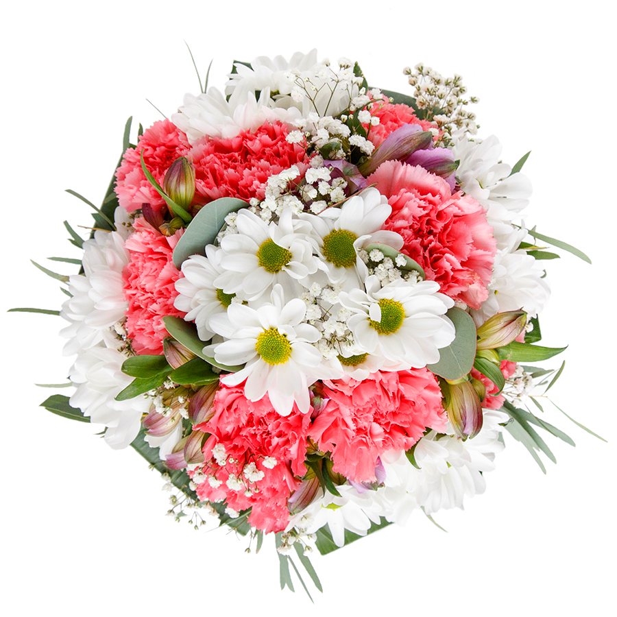 Experience the allure of our meticulously curated floral arrangement, designed to captivate and enchant. This elegant bouquet showcases a harmonious blend of luminous white chrysanthemums, airy gypsophila, and soft-toned pink carnations, artfully arranged with graceful aspidistra leaves. Each flower is hand-selected for supreme freshness and quality, ensuring the bouquet remains vibrant for up to 5 days.